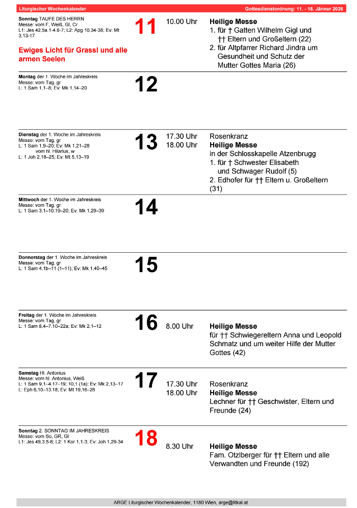 Es gibt 3 Proben am Sa. 29.11., Sa. 13.12 und Sa. 20.12 jeweils um 09.00 Uhr in der Pfarrkirche. Anmeldung bei Elisabeth Hackl: 0650/5076121 - wir freuen uns auf euch!